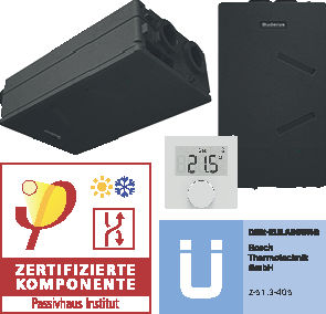 Wohnungslüftungsgerät m. Wärmerückgewinnung für die zentrale Be- und Entlüftung von Wohnungen im Mehrfamilienhaus und Einliegerwohnungen im Einfamilienhaus. Inklusive Aufhängeschiene und -element zur Decken- oder Wandmontage sowie der Fernbedienung Logamatic RC100H mit integriertem Feuchtesensor. Grundkörper aus vollgedämmtem, wärmebrückenfreiem expandiertem Polypropylen (EPP). Energetisch optimierter Kreuz-Gegenstrom-Luft/LuftWärmetauscher aus Kunststoff. Optionaler Einsatz eines Wärmetauschers mit SommerBypass oder eines Enthalpie-Wärmetauschers inkl. Bypass möglich (Zubehör). Energieeffiziente, geräuscharme Zu- und Abluftgebläse, die in 4 Lüftungsstufen betrieben werden können. 6 Anschlussstutzen aus EPP mit DN100 zur wahlweisen Montage an der Wand oder unter der Decke ermöglichen die dampfdiffusionsdichte Anbindung an das Kanalsystem. Zuverlässige Ableitung von Kondensat durch entsprechende Neigung des Wärmetauschers, geräteinterne, sichere Kondensatführung zum Siphonanschluss, integrierter Kunststoffauslass zur Montage eines Kondensatschlauchs. Filter mit Filterüberwachung: ISO 16890 (F7 nach EN779) Internes Steuergerät mit Geräteverdrahtung für elektrischen Anschluss. Datenerhalt bei Stromausfall. LED-Betriebsund Filterwechselanzeige. Gerätebedienung über im Lieferumfang enthaltene Bedieneinheit Logamatic RC100H oder per Komfort-Bedieneinheit Logamatic VC310 (optionales Zubehör). Wahlweise Automatikmodus durch bedarfsgeführte Steuerung (Feuchtefühler) Zeitprogramm oder manuelle Regelung. IP-Schnittstelle (als optionales Zubehör erhältlich) über das Funkmodul MX300 mit Wandhalter / Magnetbefestigung.