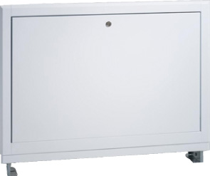 Verteilerschrank Economy Größe 3 UVSBreite 850mm, UnterputzVerteilerschrank "Economy"zur Unterputzmontage aus verzinktemStahlblech, alle sichtbaren Teile weißpulverbeschichtet, 4 verschiedene Größen(Breiten) lieferbar und im KartonverpacktTiefe 110 bis 165mm,Höhe 585 bis 660mmVor- und Rücklaufanschlüsse wahlweisevon links, rechts oder unten, abnehmbareTür mit Drehverriegelung inkl. 2Verteilermontageschienen und 8Befestigungsschrauben